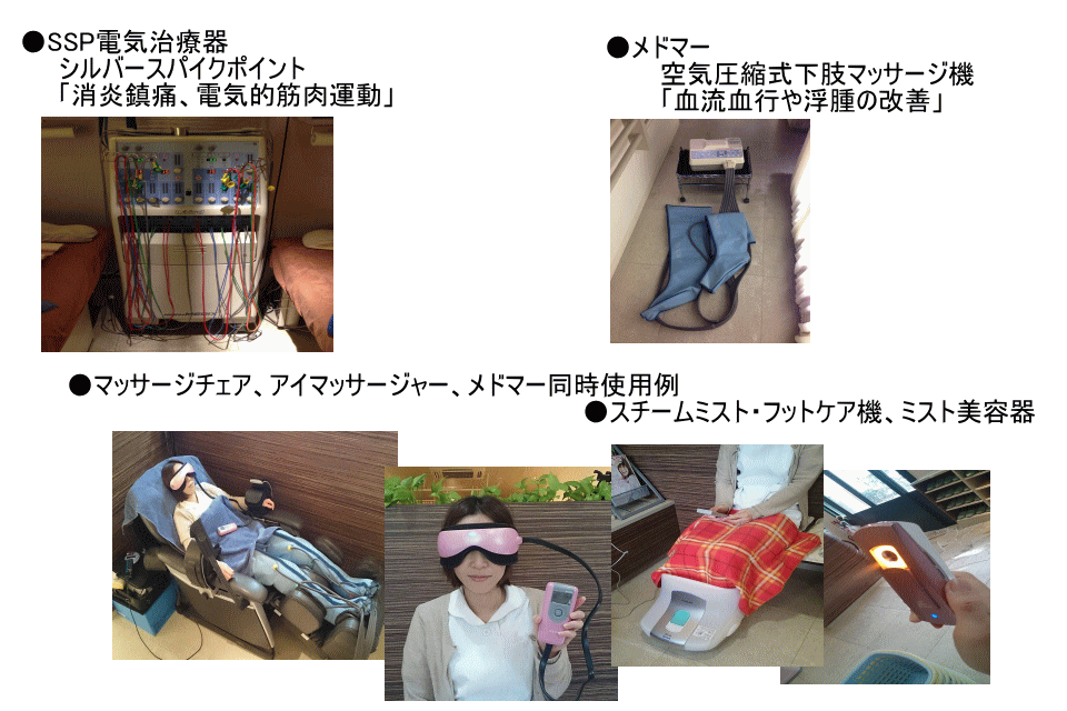 施設のご案内 患者様がリラックスして施術を受けて頂けるように。 癒しの空間づくりを目指しています。 お子様から御高齢者の方、女性や男性に関係なく全ての施術と空間の提供を行っています。 乳児をお子様連れでも安心してご利用でき、親御様の施術時間中も安心してご利用できる工夫をしています。 治療機器、美容について