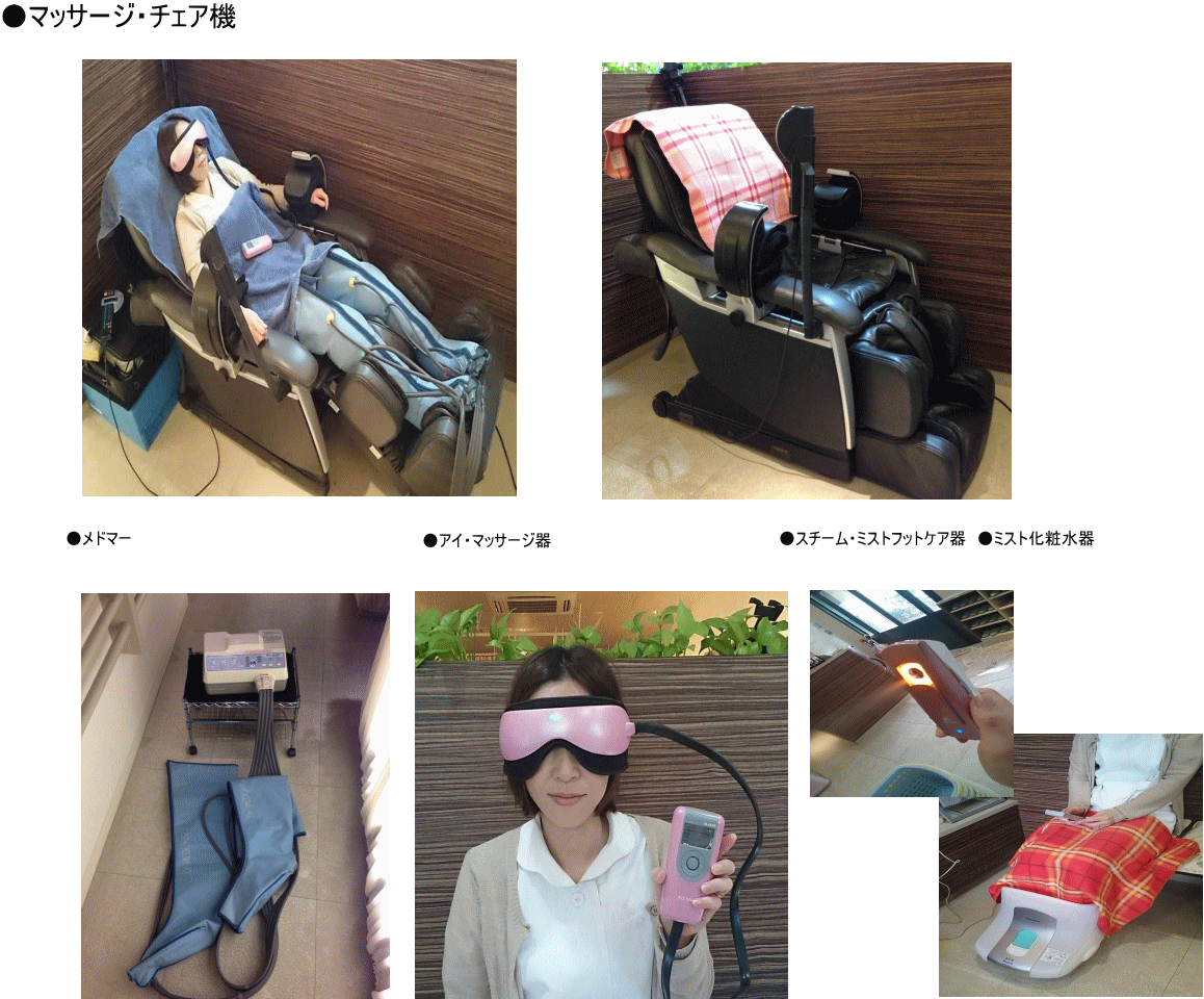 ・空気圧下肢マッサージ機:血流血行改善。プロメドマーといわれる機種で。ブーツ内に圧縮空気を送り足の循環を強制的にする事で 血流や血行改善などを行い特に女性の氣になる「むくみ」の改善に大きな効果を出し。 老廃物の排泄効果による筋肉痛の軽減も期待できる。 Jリーガーの選手が起こしたことで有名な「エコノミー症候群」の予防にも使われた。 現在、医療用であるのはこのメーカーのみで最上位機種を使用しています。